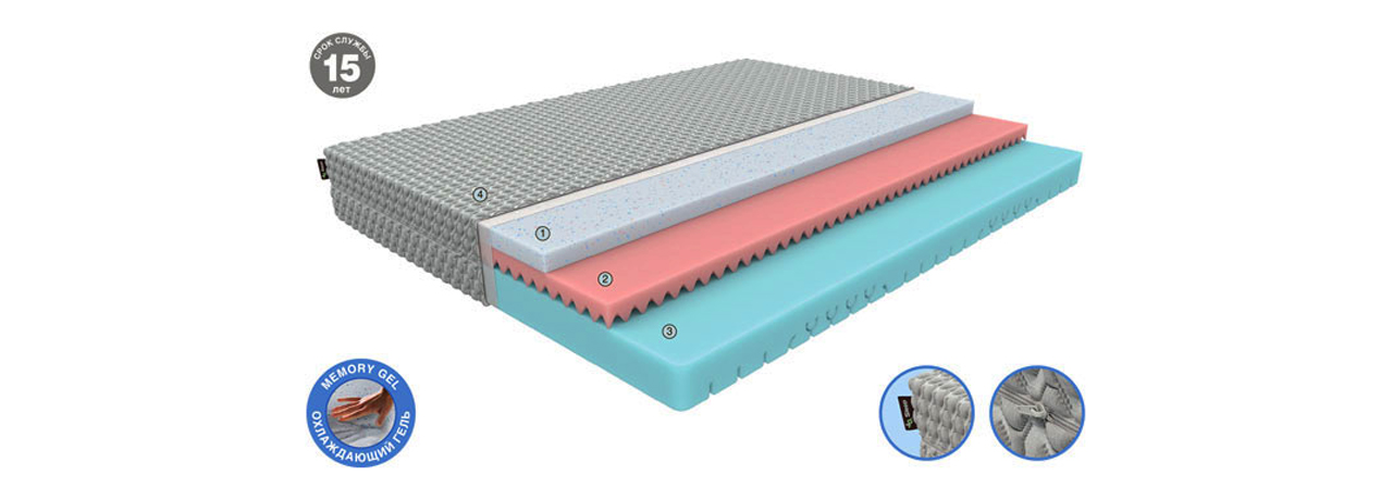 Пена с ячеистой резкой в центре матраса обеспечивает превосходную терморегуляцию, отведение избыточного тепла, помогает лучше распределять вес спящего, работая как мини-пружинки, дает оптимальный переход жесткости слоев.